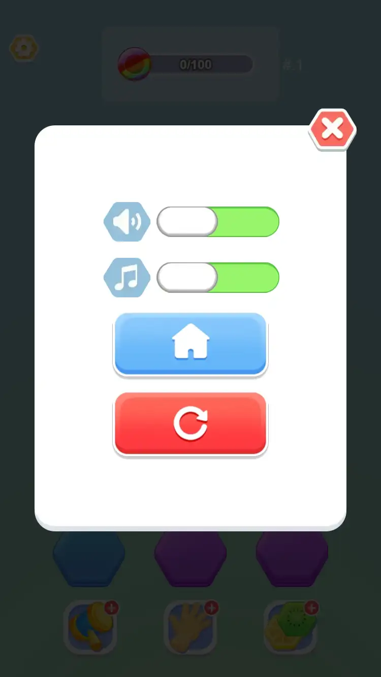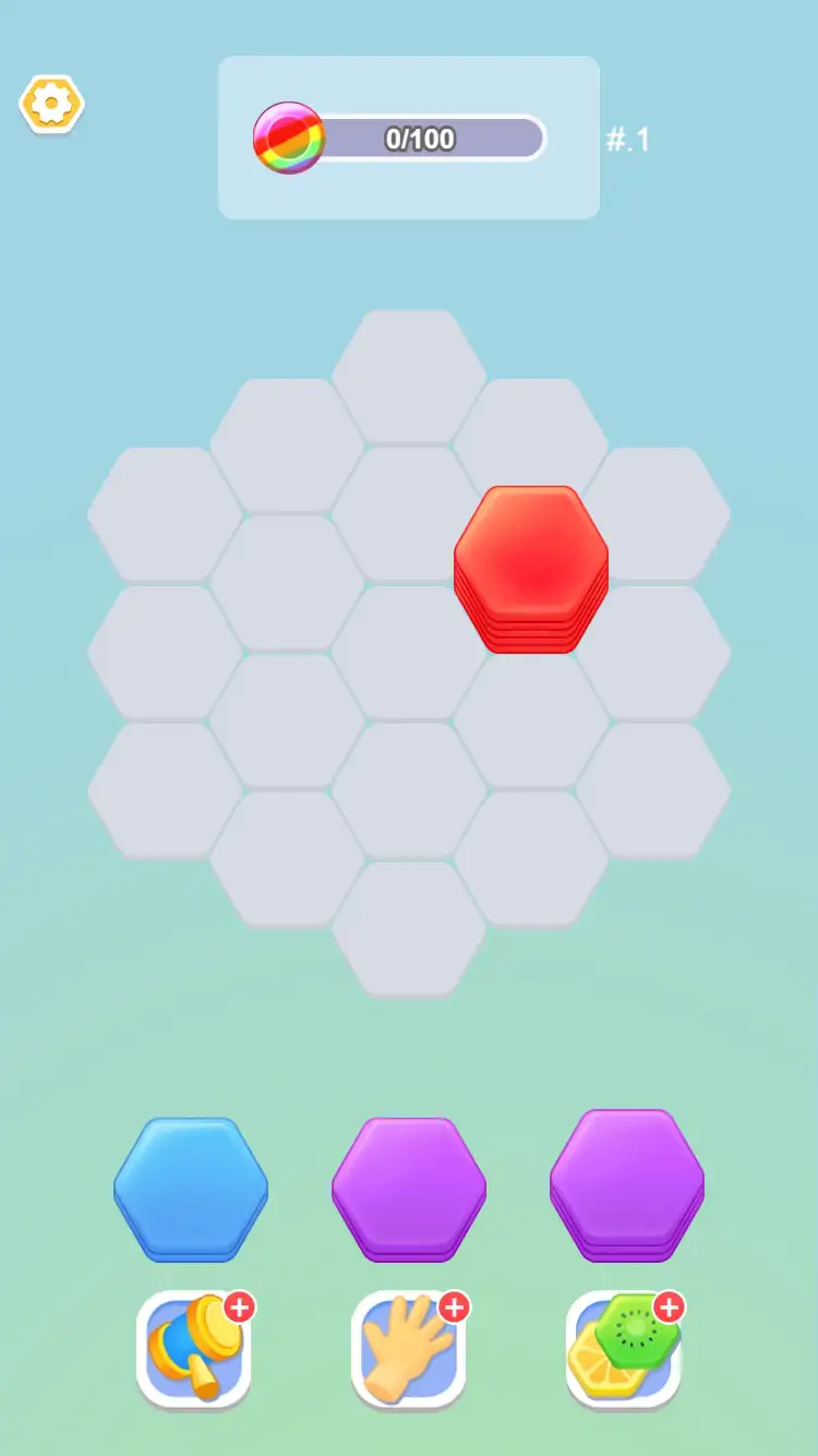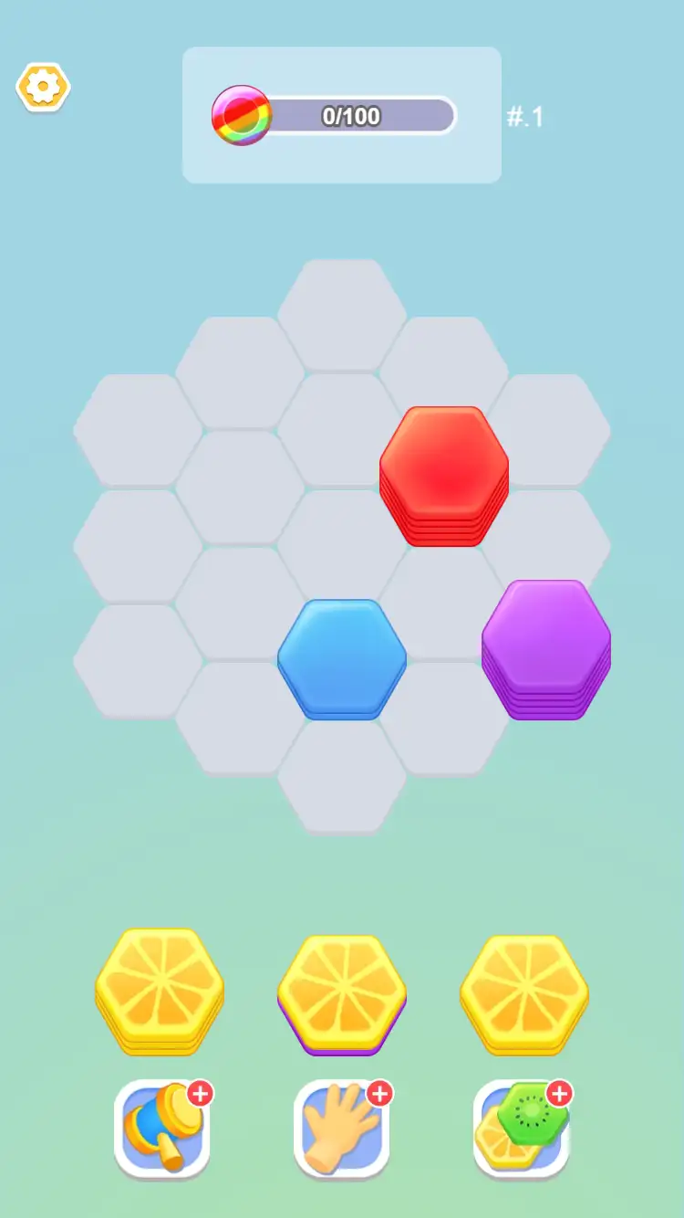 Game Content: In Hexagon Sort, the player's task is to correctly sort hexagonal patterns of the same color. You need to drag the color blocks from the bottom into the grid, trying to place the same colored blocks together. When the required number of the same colored blocks are placed together, they will merge and disappear from the field, earning you points.