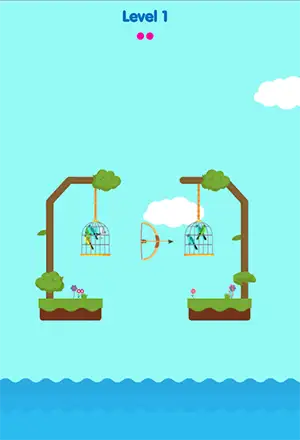 (Use a bow and arrow to rescue the birds trapped in cages. Players must carefully aim and shoot the ropes holding the cages to free the birds and complete the level.)