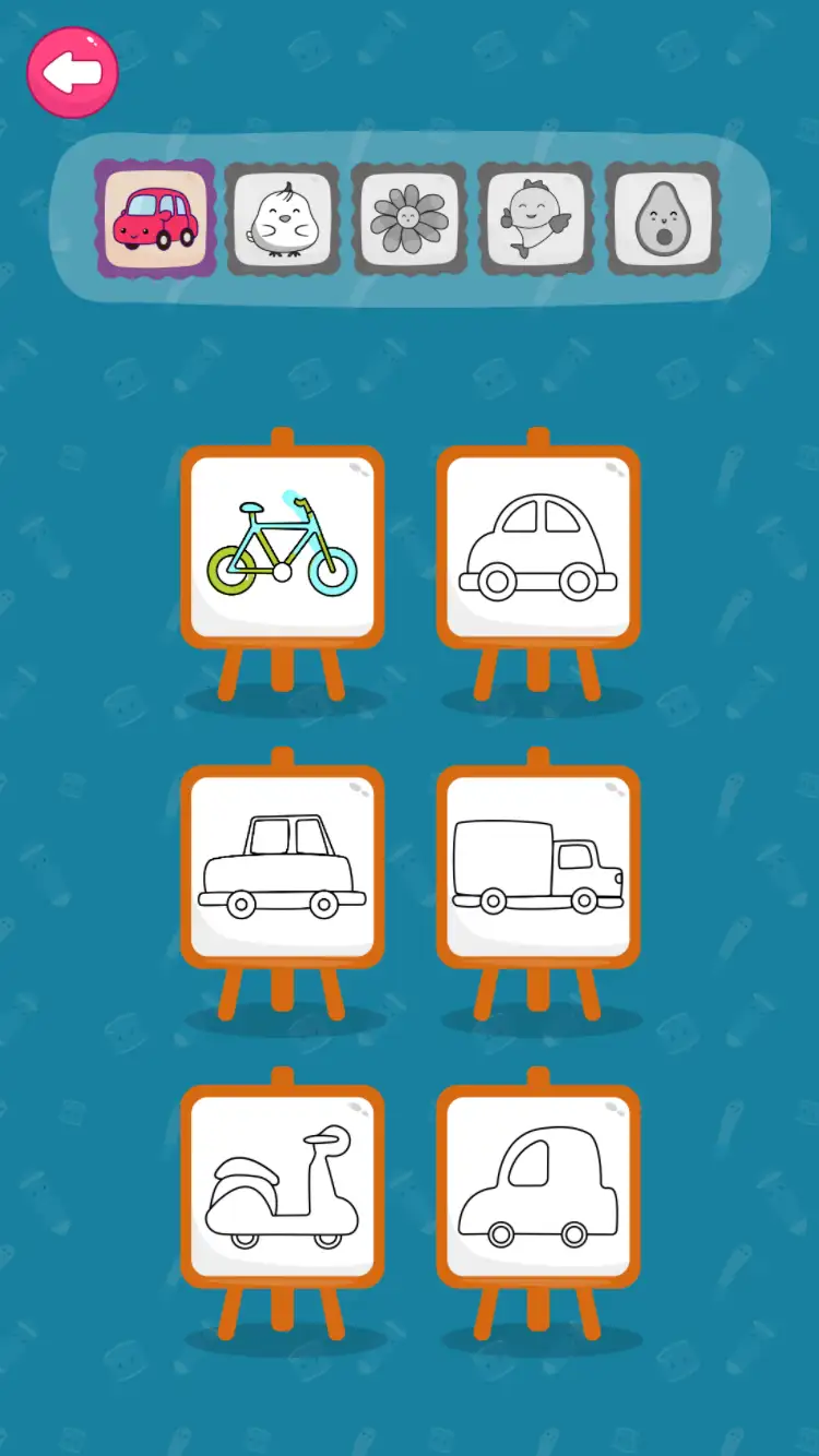 (A coloring game designed especially for children, aimed at inspiring their imagination and creativity. The game offers 30 playful illustrations across five categories: plants, animals, fish, fruits, and vehicles.)
